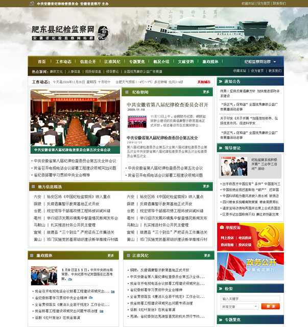 安徽纪检监察网是中共安徽省纪委、安徽省监察厅门户网站群。以省辖市作为行政划分,我们在网站群的设计工作中,规避了机关网站惯用的华表、长城、天安门等“党性”主题,因为其通用性过强,不能良好的体现城市差异性。我们取而代之的是挖掘该城市当地的文化特色,并与各地方详细探讨,取其精华,作为设计元素。